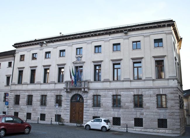 Today’s building is an enlargement, designed in 1926-28 by architect Alberto Alpago-Novello, to close in a monumental way the southern perspective of Piazza Duomo, in order to host the Province’ administration, whose previous seat was in the nearby Piloni palace. The new building was erected where there used to be the old city grammar school,…